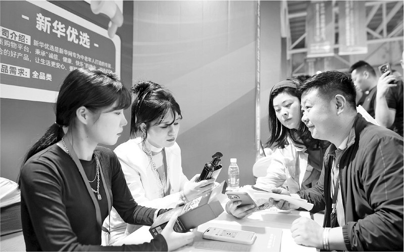 5月17日至19日,中国(临沂)私域直播品牌博览会在临沂国际博览中心举行。全国1000多家知名私域直播平台和1500余家生产企业进行了筛选直播爆款和签约合作,为生产企业和私域直播从业者提供了广阔的销售渠道和丰富的直播产品门类。图为两名私域直播平台工作人员与生产企业销售人员进行选品对接。 (本报通讯员 尹召功 孙磊 摄)