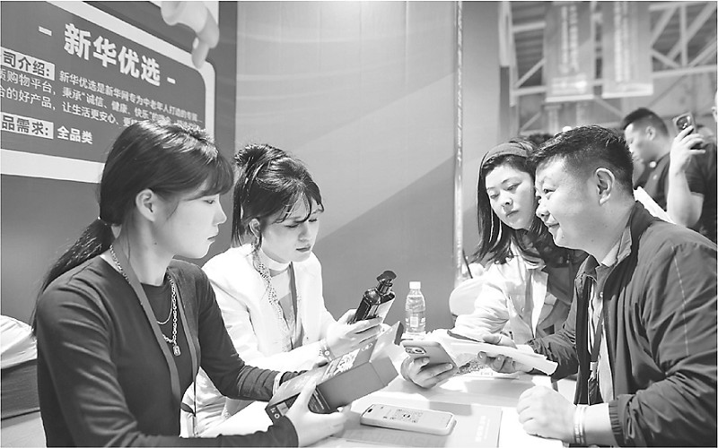 近日,中国(临沂)私域直播品牌博览会在临沂国际博览中心举行。全国1000多家知名私域直播平台和1500余家生产企业进行了筛选直播爆款和签约合作,为生产企业和私域直播从业者提供了广阔的销售渠道和丰富的直播产品门类。图为两名私域直播平台工作人员与生产企业销售人员进行选品对接。