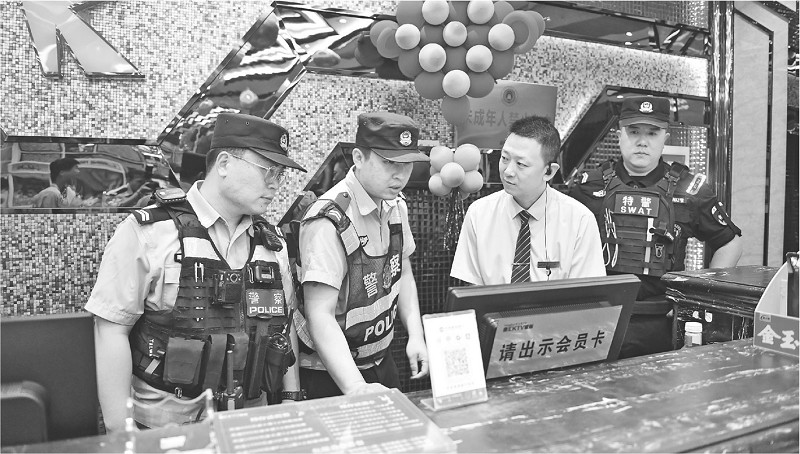 为助力夜间经济发展,深化“齐剑2025”专项行动,最大限度挤压犯罪空间,近日,淄博市公安局在全市范围内部署开展夏季社会治安第一次清查行动,对治安复杂区域、潜在风险场所、重点行业进行全方位清查整治,严查治安问题隐患,严打突出违法行为。图为淄博市公安局周村分局大街派出所民辅警到辖区公共娱乐场所进行检查。 (本报通讯员 刘磊 于德忠 摄)