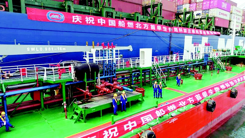 当日,北方港口首单国际航行船舶生物燃料油加注业务在山东港口青岛港完成,“现代温哥华”轮接受到1300吨B24生物燃料油补给。 (新华社记者 李紫恒 摄)