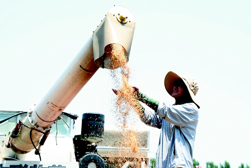 韩学润看着收获的小麦一脸喜悦