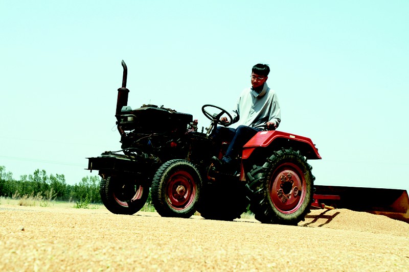 韩学润在打麦场驾驶农业机械晾晒收获的小麦