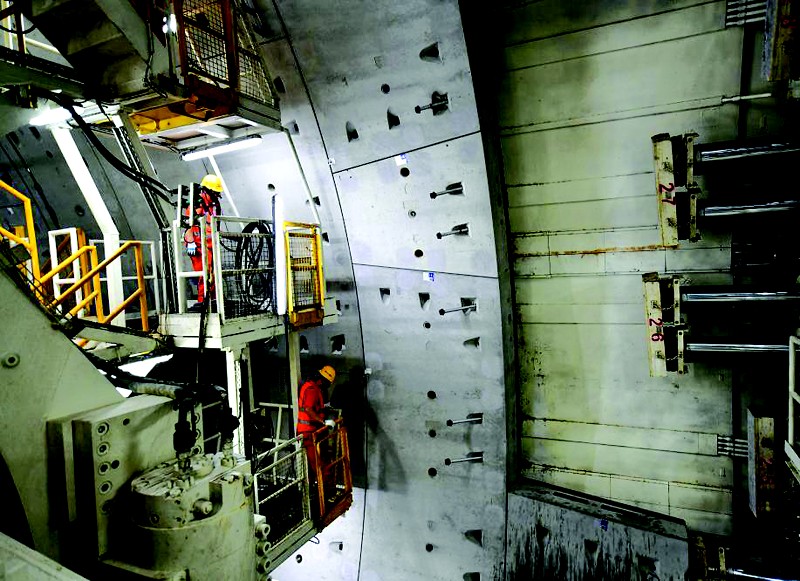 6月22日,中铁十四局建设者在济南市黄岗路穿黄隧道内作业。