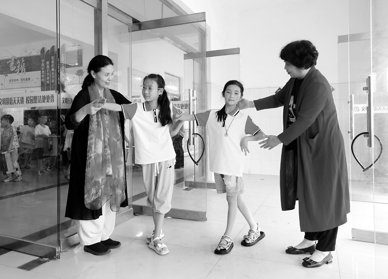 6月19日,嘉祥县李霞山东梆子剧团的演员为学生指导戏曲基本动作。