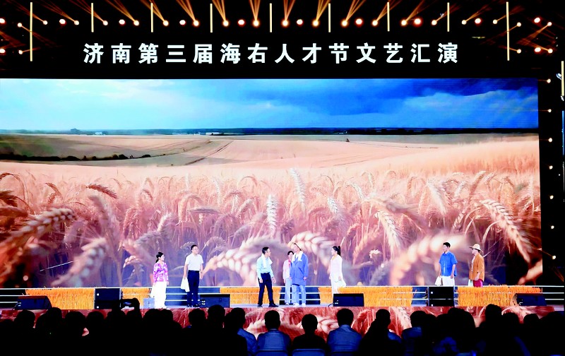 6月25日晚,第三届“海右人才节”文艺汇演晚会在济南奥体中心东荷体育馆上演。晚会三大篇章层层递进:《Lian上济南这座城》以悠扬旋律勾勒城市魅力;《向新而行》用沉浸式表演重现济南高新区30年创新发展中人才与城市的奋斗岁月;《向阳生花》朴实刻画“济麦”育种团队扎根土地的科研坚守。AI短片中李清照、泰戈尔跨时空对话,尽显济南开放包容。高校学子与企业青年合唱《青春济南》,许下“以青春之我建青春之城”的誓言。晚会尾声,观众与演员共唱《如愿》,致敬每一位济南建设者。 (本报通讯员 济宣 摄)