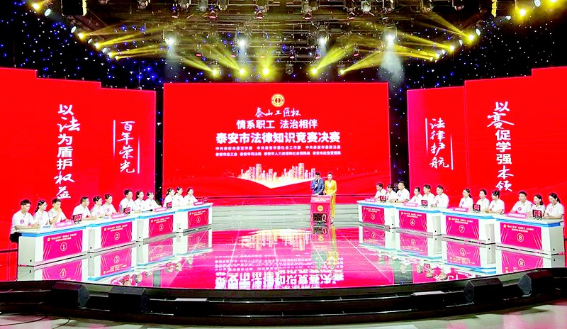 6月26日下午,“泰山工匠杯”“情系职工·法治相伴”泰安市法律知识竞赛决赛举行。活动由泰安市委宣传部、市委社会工作部、市委政法委、市总工会、市司法局、市人力资源和社会保障局、市应急管理局主办,历时两个多月,历经初赛、复赛、线上答题等阶段,吸引了全市各系统行业职工参与,线上答题参与人数近2000人次。最终,8支代表队的24位选手进行了决赛。图为决赛现场。