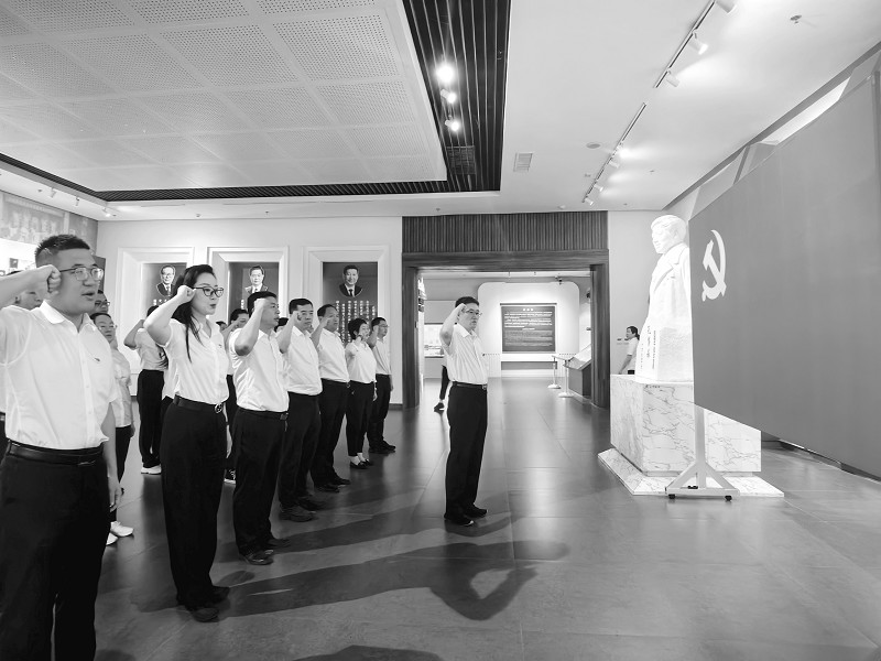 6月27日上午,中铁十四局海外公司组织党员前往孔繁森纪念馆参观学习,并举行重温入党誓词仪式。活动中,党员们认真聆听孔繁森同志的先进事迹,深刻感悟其一心为民、廉洁奉公的崇高精神。此次活动正值全党开展深入贯彻中央八项规定精神学习教育和集团公司反腐倡廉教育月活动之际,党员们纷纷表示,将以孔繁森为榜样,以更加优良的作风投入到海外事业高质量发展中。图为党员在重温入党誓词。 (本报通讯员 王丽 摄)
