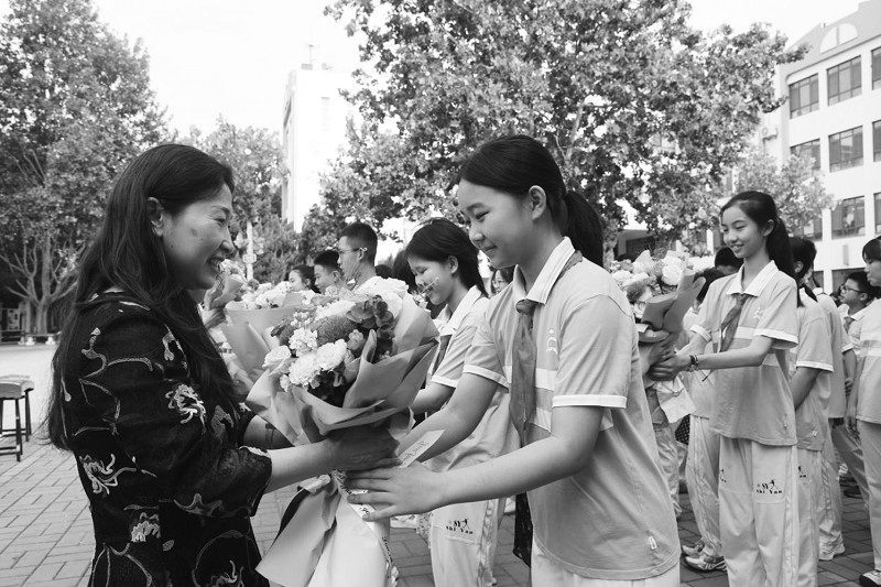 6月30日,德州市实验小学为六年级356名毕业生举行了以“童心飞扬 逐梦启航”为主题的毕业典礼。图为毕业生代表给老师送上感恩的鲜花。 (本报通讯员 高向阳 摄)