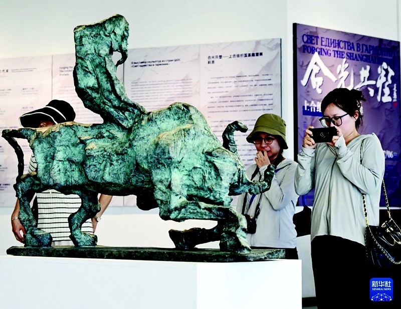 7月1日,“合光共塑”——上合组织国家雕塑展在青岛举行。本次展览的主题为“艺塑同心 命运与共”。图为观众在雕塑展上参观、拍照。 (新华社记者 李紫恒 摄)