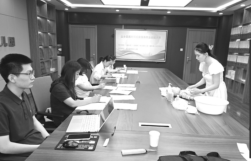 近日,金乡县总工会联合县卫生健康局、县计划生育协会举办全县第四届托育服务职业技能大赛。本次大赛分为理论考试和技能操作两部分,考试内容包括3岁以下婴幼儿照护服务的政策法规、教育理论、照护与保育等知识。图为大赛实操现场。