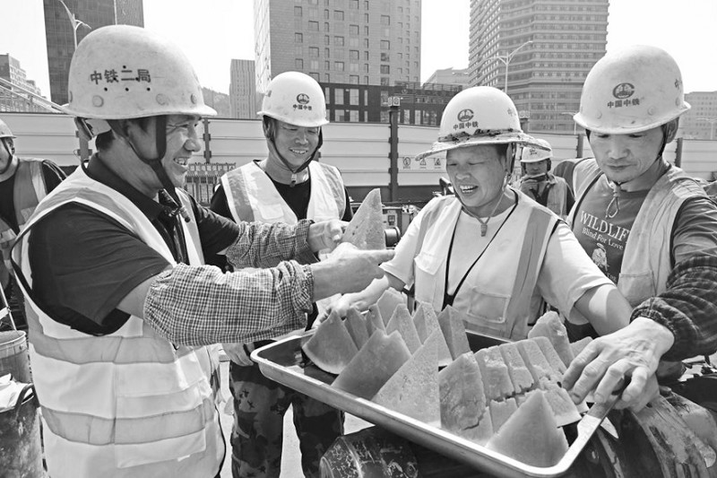 7月11日,在中铁二局青岛地铁5号线青医东站项目工地,工人在作业间歇领取西瓜。