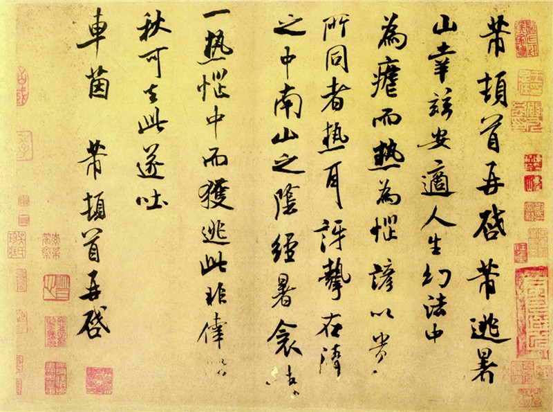 北宋文化的蓬勃与思想的包容,滋养了米芾的艺术个性。相较于唐楷的法度森严,宋代书家更重情感抒发与意趣表达。 《逃暑帖》以笔墨为媒,将暑日逃遁的闲适、人生幻法的哲思,化作灵动线条,成为 “尚意”浪潮中独特的浪花。它见证着米芾对传统的突破,更映照出那个时代文人对精神自由的追寻。