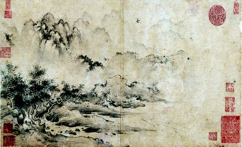 马和之在设色上的克制令人赞叹。整幅画卷仅通过墨色的深浅变化来表现光影和物体的朝向,松针以浓墨聚集如伞,山石则以飞白技法留出云雾的效果。画中没有一处是多余的笔触,即便是岩石缝隙间的几笔苔点也与音律相呼应。这种“计白当黑”的构图方式,使观者的目光在虚实之间游走,仿佛随着溪水漂流,时而遇见隐逸的鹤影,时而望见云开月现的山巅。