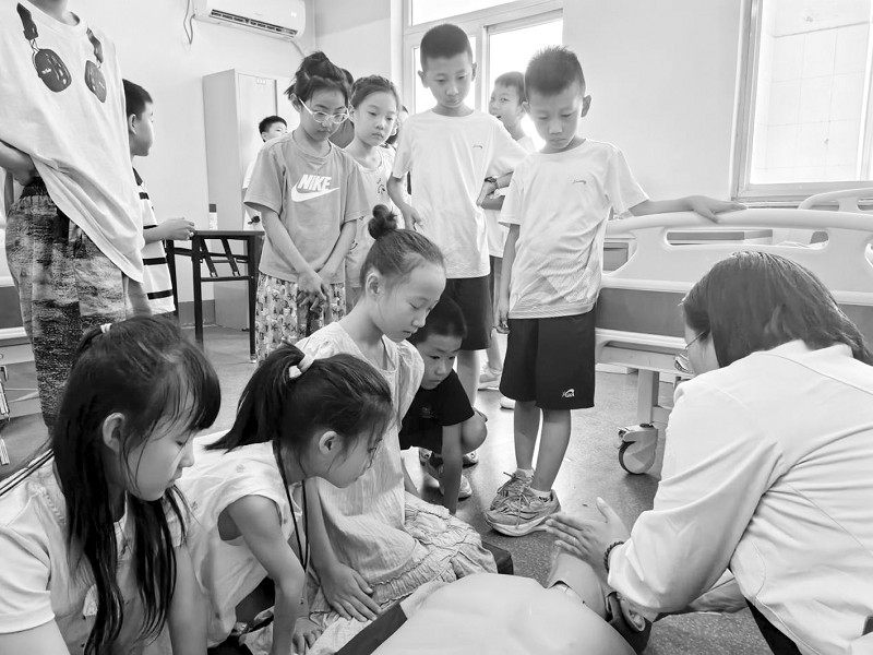 暑假以来,商河县整合各方资源,积极引导各基层单位因地制宜开展职工子女暑期托管班,重点面向外来务工家庭、困难家庭及新就业形态劳动者精心打造 “爱心托班”,通过开展丰富多元的课程与实践活动,为职工子女提供安全可靠的暑期去处。图为暑期托管班防溺水、心脏复苏安全教育课现场。