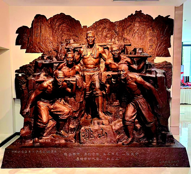 注:铸铜雕塑“挑山”由山东省总工会捐赠,山东工艺美术学院副教授曹淑海设计,现陈列于中国工人运动历史和发展成就展展厅。