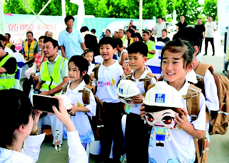 7月22日,在青岛市城阳区中建八局一项目部,孩子们领到 “爱心礼包”。