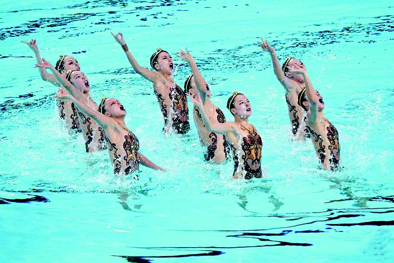 7月22日,在新加坡举行的2025年世界游泳锦标赛花样游泳集体技术自选决赛中,中国队夺得冠军。图为中国队在比赛中。