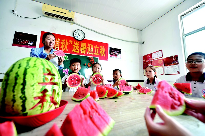 8月6日,在聊城市茌平区贾寨镇综合站,小朋友们在参加立秋吃西瓜活动,迎接立秋节气的到来。