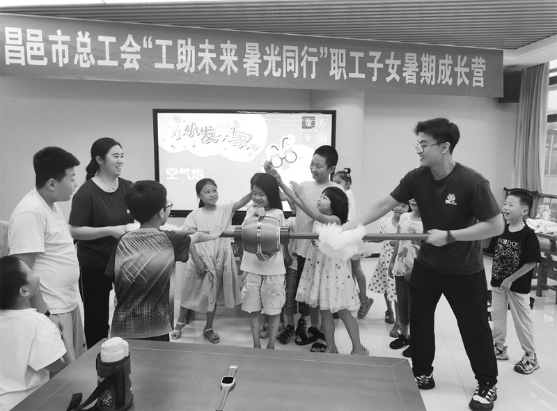 日前,由昌邑市总工会主办的“工助未来 暑光同行”职工子女暑期成长营科学探索营结业。为解决职工学龄子女暑假“看护难”问题,同时丰富孩子们的暑期生活,该成长营精心设计多种活动。在营期间,孩子们借助空气炮、马德堡半球等趣味实验探寻科学奥秘,在探索中培养了兴趣、增长了见识。图为趣味实验现场。 (本报通讯员 刘凯丽 摄)