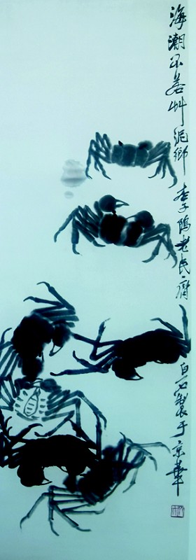 在齐白石的绘画创作中,最令人津津乐道的是他画的蟹与虾,他画蟹与画虾齐名。他一生画了许多螃蟹题材的名作,如《双蟹》《墨蟹图》《螃蟹》《群蟹》《虾蟹图》等。他笔下的螃蟹画作,有的描绘螃蟹生长环境的,如《鱼蟹》《芦蟹》等;有的反映人们捕捉螃蟹场景的,如《篓蟹图》《篓蟹》等;有的展现烹调食用螃蟹情景的,如《酒蟹》《蒸蟹黄酒》等。他所画的螃蟹惟妙惟肖,神形俱佳,不愧画蟹之名家。