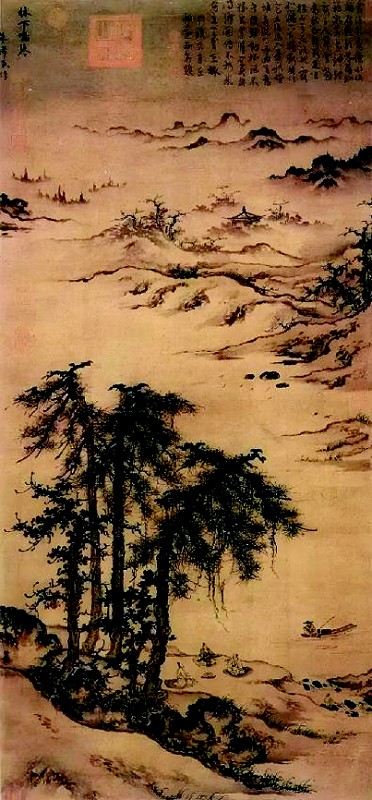 琴,作为“琴棋书画”四艺之一,自古便是文人修身养性、寄托情怀的象征。其历史可追溯至数千年前,从相传伏羲制琴的传说到春秋伯牙与钟子期“高山流水”的知音典故,琴始终承载着文人超脱世俗、追求精神自由的理想。至元代,抚琴之风更盛,文人常以琴会友,于山水间寻觅心灵共鸣。朱德润此作,正是这一文化传统的生动写照,画中三位高士身着素袍,神态从容,一人似正抚弦奏琴。河中渔夫摇桨趋近,取水僮仆亦回首凝望,高士琴会遂成画中焦点。对岸坡渚与远山被烟霭轻笼,层层延展,琴音与松风、泉声交织,勾勒出悠远静谧之景。