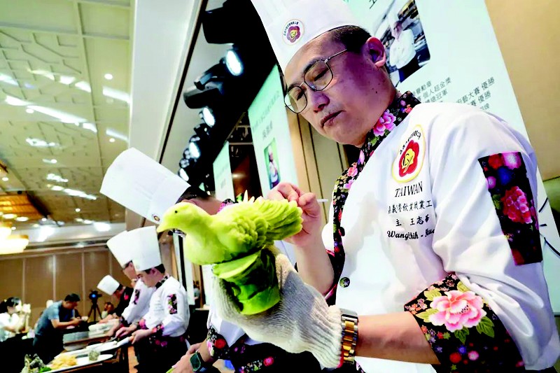 8月14日,由山东省总工会主办,山东工会对外交流与工运研究中心、山东省财贸金融工会、台湾台中直辖市总工会、台湾嘉义市餐饮业职业工会、齐鲁名厨工匠创新联盟承办的鲁台职工厨艺技能交流展会在济南舜耕山庄举办。来自台湾和山东的厨师们以 “蔬果雕刻”和 “鱼鲜料理”两大主题展开技艺切磋和交流,共促中华美食文化的传承和创新。图为活动现场。