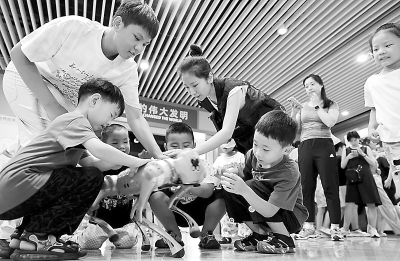 8月17日,小朋友在枣庄市科技馆与机器狗互动。