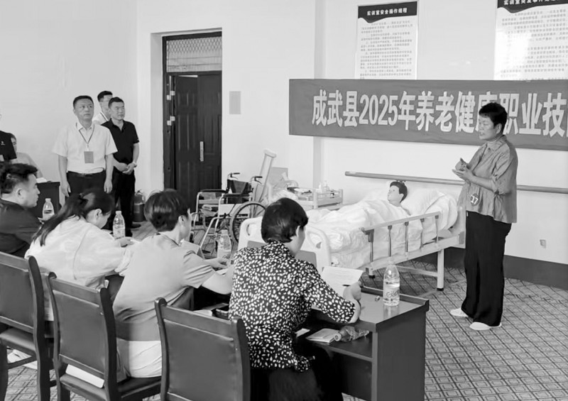 8月15日至18日,由成武县总工会、县人社局、县民政局、县卫生健康局联合主办的2025年全县养老健康职业技能竞赛在县技工学校举行。本次竞赛设养老护理员和健康管理师两个赛项,重点考察选手在老年人生活照料、康复护理、慢病管理、健康评估等情境中的综合应变与服务创新能力。图为养老健康职业技能竞赛现场。 (本报通讯员 朱超 摄)