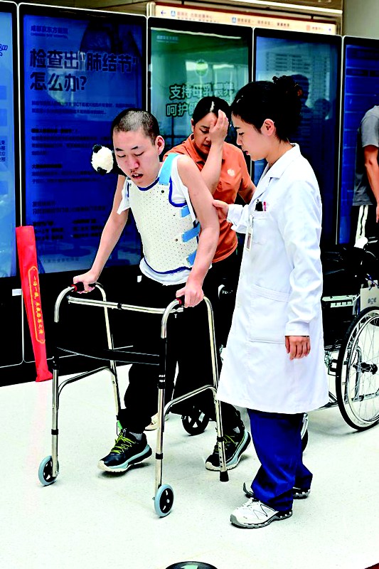 8月25日,姜延琛在助行器的辅助下独立行走。