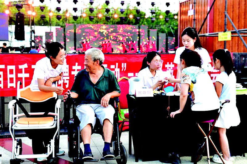 8月25日,在惠民县孙武广场,民政局的工作人员向市民介绍辅助器具申领相关惠民政策。