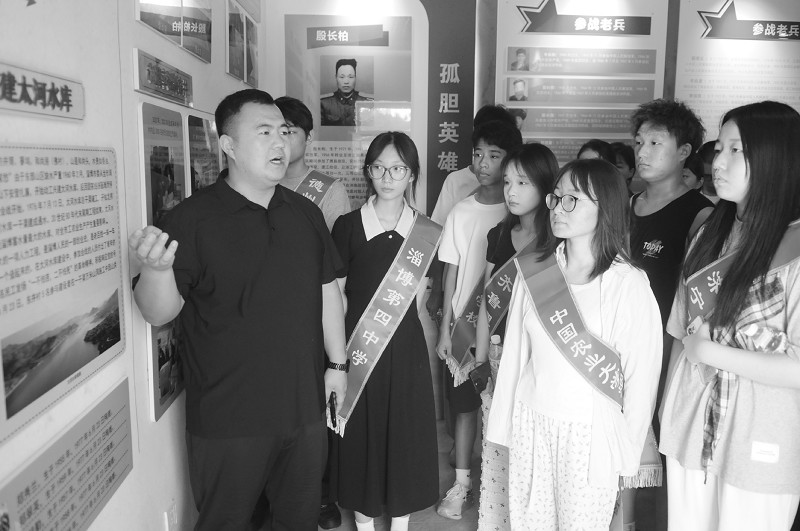 8月22日,淄博市淄川区寨里镇东井村党支部书记牛学臣(左一)正在向本村学生讲解村史。