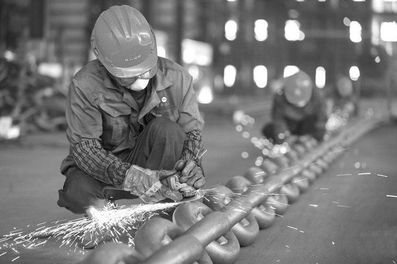8月25日,青岛锚链股份有限公司工人在生产出口到海外市场的锚链产品。