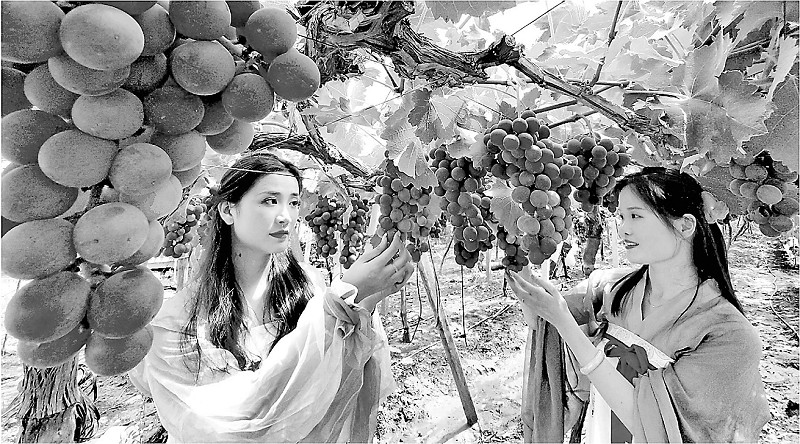 9月7日,身着汉服的游客在菏泽市牡丹区高庄镇东头村葡萄种植基地采摘葡萄。当地创新推出“葡萄架下的汉服秀”特色文旅项目,吸引众多传统文化爱好者前来打卡。