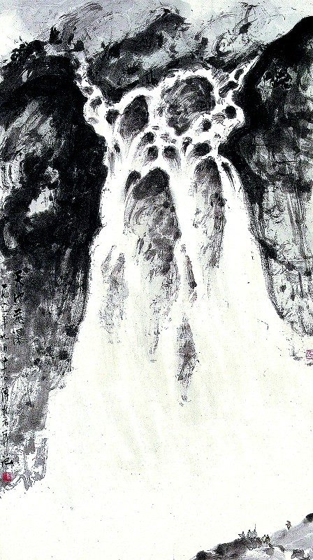 夏季的长白山,云飘雾漫,风雨莫测,这种变化多端的气象,正合傅抱石的心意,雨景、泉瀑是他一生专注的绘画创作对象,尤其擅长描绘瀑布景观,人称 “抱石画水,如闻其声”。在画天池瀑布时,他并不盲目动笔,而是认真观察地貌形态,反复揣摩,寻找最佳的表现视角。他在 《我的几幅写生创作稿构思过程》一文中写道: “我到长白山写生,长白山很大,不可能一下子全都观察到。最先看到的是长白山瀑布,瀑布的水由长白山山顶上著名的天池里大量溢出,气势极为雄伟,水口有二山相峙,急流奔腾而下,水势极猛,十分壮观。长白山瀑布与天池分不开,必须登山顶观看,天池四面环山,像一块碧玉装饰在群山之中,由于山顶高寒,不长树木,雾气弥漫,很有一点神秘的色彩。山的中下部是针叶林,长白山林海是在山的下部。瀑布下面有一段很长的乱石湍泉,曲曲弯弯流向远方,这便是松花江的源头。游遍长白山的上上下下以后,对它有了全面的了解,便有助于掌握长白山瀑布独特的气势。它与天台山的石梁瀑、庐山的三叠泉、贵州的黄果树瀑布都不相同。我采用取上舍下的办法,突出了长白山瀑布从天而降的气势”。根据流传作品和画上题款看,傅抱石从6月到9月先后共创作了 《天池飞瀑》 《天池瀑布》等多幅长白山瀑布作品,多取正面、仰视构图,瀑布占据画面的绝大部分,下部地面仅留一角,重点描绘瀑布流泻的形象,给人以壮阔扑面的视觉感受。在笔墨技法上,施以其独创的、形成于早年客居重庆金刚坡的 “抱石皴”,劲毫散扫,笔根点压,墨色浓重,水气淋漓,生动地表现出瀑布的质感和流动之势。傅抱石认为,画山水不是无景造象,也不是对景造形,而是对景造意,缺乏隽永的意境,缺乏感人的魅力,只能是风景说明图。借笔墨以写天地万物而陶咏乎我,他笔下的长白山瀑布,既是自然之象,又是心中之相,是自然与情感的融合之物,彰显出强烈的个人精神气质和审美取向。
