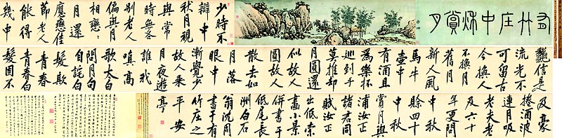 《有竹庄中秋赏月图》是明代画家沈周的山水画代表作。成化二十二年 (1486年)中秋,沈周60岁,邀请友人赴有竹庄共度佳节,后应友人之请,作画描绘在平安亭内饮酒赏月的情景。图卷右端引首有同乡好友 “贞伯”李应桢题写的 “有竹庄中秋赏月”7个篆字。卷尾是沈周自己所写的题识诗和跋语,交代了诗、书、画的创作由来。有竹庄原名西庄,是沈氏世代读书、吟诗、作画的隐居寓所,也是四方名士文会往来的地方,自沈周祖父开始营建,经三代人共同打造,成为彼时苏州文人雅集的第一场所。