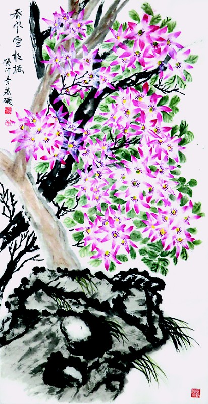 马基础的艺术之路,是“师法自然、师法传统、锤炼性灵”的典型写照。他出生于济南,家乡的山泉风貌与浓郁生活气息,早早在他心中播下了亲近自然、热爱生活的种子,童年记忆里鲜活的生活画面,成为他日后创作源源不断的灵感源泉。与艺术的深度结缘虽始于年近花甲——偶然因一本吴泽浩先生的画集重拾梦想,继而拜入其门下,但这份迟来的热爱却带着极致的执着:他不仅潜心研磨传统花鸟画的精髓,从篆书书法中汲取线条力量;更坚持“外师造化”,无论是村头院落随境而生的蜀葵、植物园中带着传说色彩的曼陀罗,还是牡丹、荷花、紫藤等常见花木,都成为他写生与创作的对象,在自然中体味生命本真,丰富艺术感受。