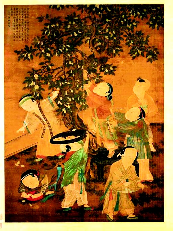《扑枣图》不仅仅是一幅描绘孩童扑枣场景的画作,它还蕴含着丰富的民俗文化内涵,如同一把钥匙,打开了那个时代文化传统的大门,让我们得以窥见宋代社会的风土人情和人们的生活方式。在宋代,枣子是一种重要的水果,它不仅具有食用价值,还象征着吉祥与丰收。“枣”与“早”谐音,有“早生贵子”“早日发财”等美好寓意。因此,在九月枣子成熟的季节里,人们常常会举行一些与枣子相关的活动,如扑枣、食枣等,以祈求好运和幸福。这种习俗不仅体现了人们对美好生活的向往,也反映了他们与自然和谐相处的智慧。