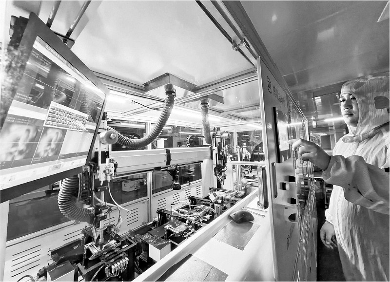 9月11日,山东多亿电子科技有限公司技术人员正在车间内察看手机显示屏全自动贴合线运行情况。