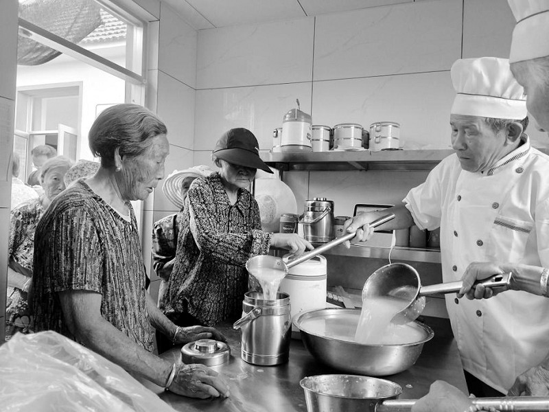 临近中午,招远市蚕庄镇西山王家村的“健康快乐驿站”内米香四溢。80岁的王恒喜捧着一桶刚打好的小米粥说:“家里就我一个人,以前吃饭总凑合,现在村里每天都有新熬的稀饭、新蒸的馒头,每天来领饭时还能和老伙计们唠唠嗑,一天的心情都特别好!”