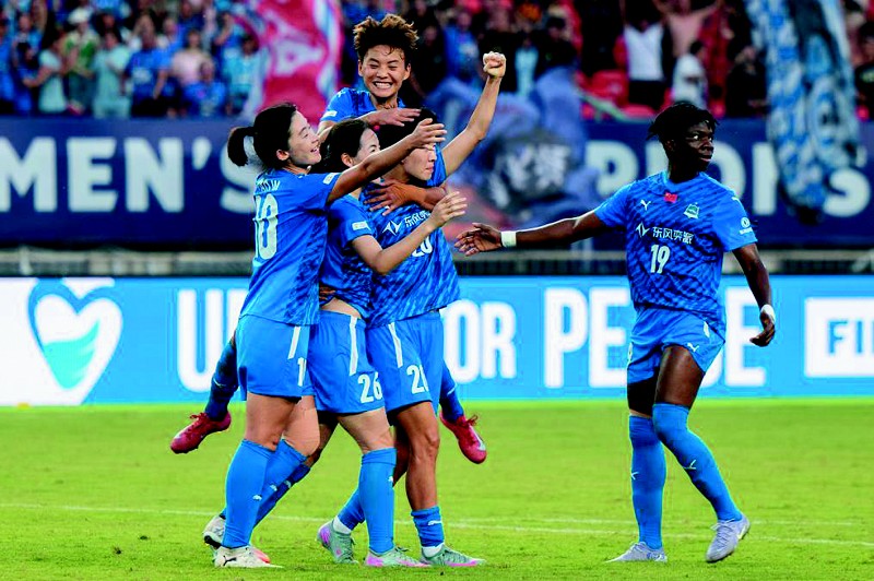 10月8日,首届国际足联女足冠军杯预选轮在武汉体育中心打响。亚足联女足俱乐部冠军联赛新科冠军武汉车谷江大女足,以1:0力克大洋洲女足冠军联赛冠军奥克兰联,成功晋级下一轮。图为武汉车谷江大队球员庆祝得分。 (新华社记者 杜子璇 摄)