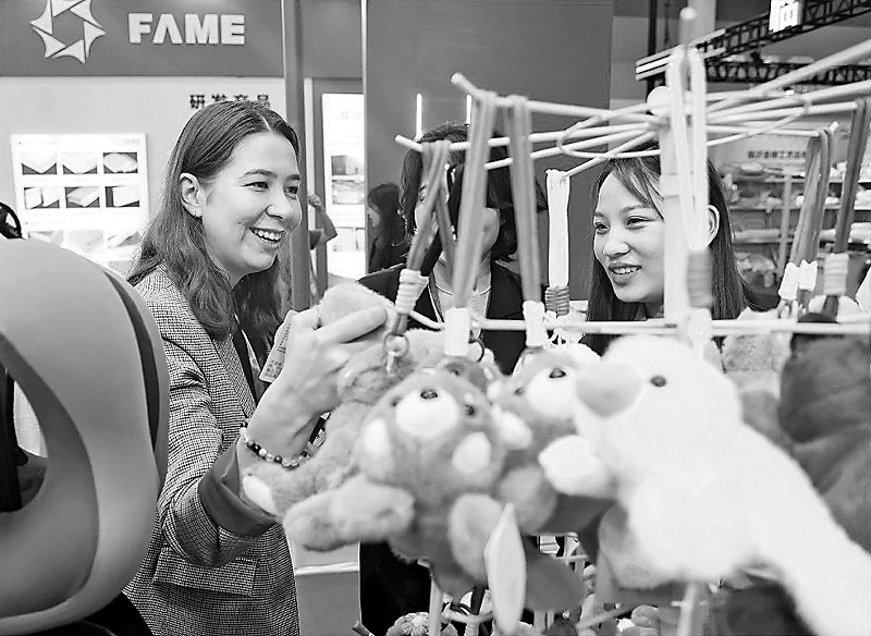 10月10日,外国客商在第三届临沂商城国际采购商大会现场采购商品。