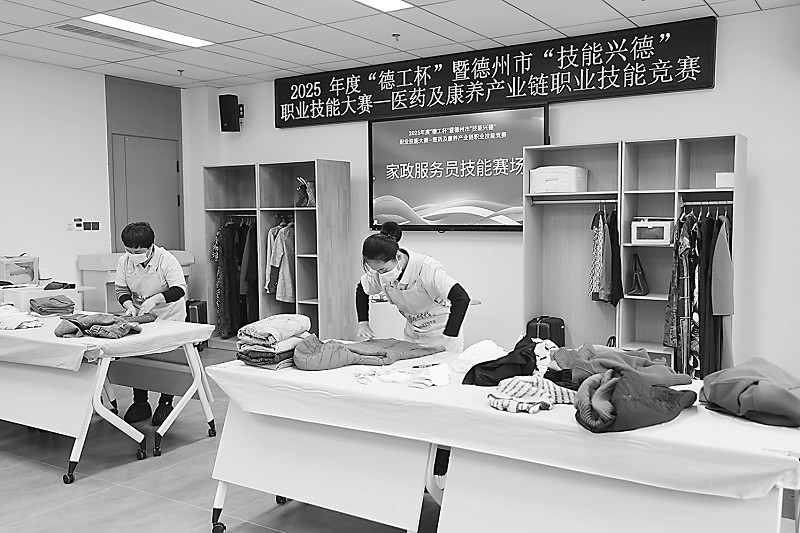 近日,德州市总工会举行2025年度德州市“技能兴德”职业技能大赛医药及康养产业链职业技能竞赛。竞赛由理论知识和技能操作两部分组成,设置家政服务员、家政经理人、家政培训师以及育婴员4个工种,涵盖家庭服务关键领域,共吸引各县市区180余名家政从业者参赛。图为技能操作比赛现场。 (本报通讯员 余佳辉 摄)