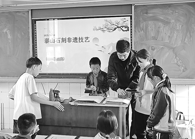 10月16日,泰安市岱岳区范镇总工会邀请齐鲁首席技师、泰安手造工匠、泰山石刻市级非遗传承人王震,走进唐北小学开展“泰山心语·匠心育人”宣讲活动。王震以“泰山石刻非遗技艺”为主题,从解读泰山石刻文化到演示创作流程,再到手把手教学生石刻基础技法,让学生在“一凿一刻”的趣味实践中理解非遗技艺传承中的匠心内涵,推动劳模工匠精神和传统文化深深扎根青少年心中。