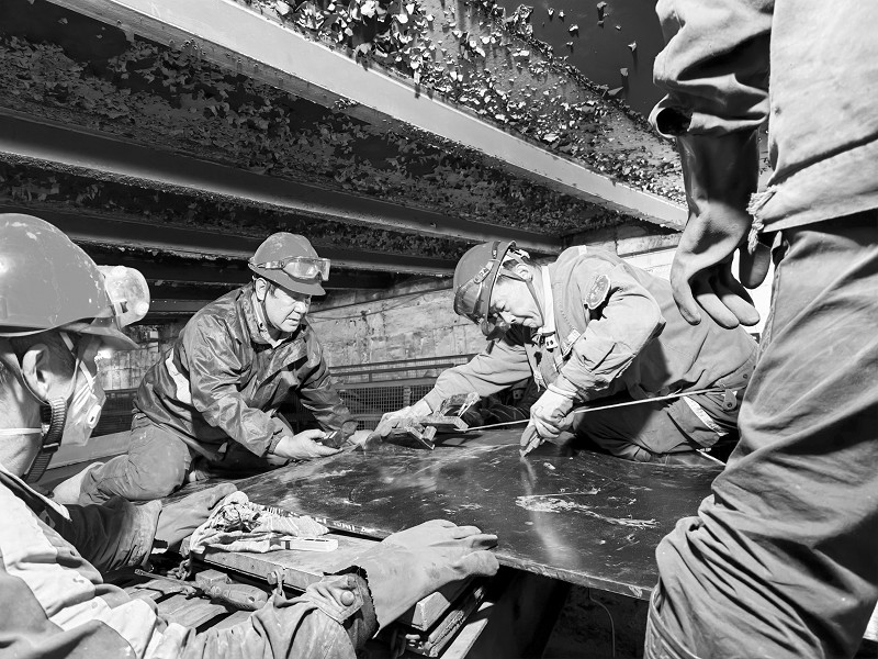 10月15日,中铝山东有限公司工业服务中心检修员工正在扒皮氧化铝输矿皮带接头。