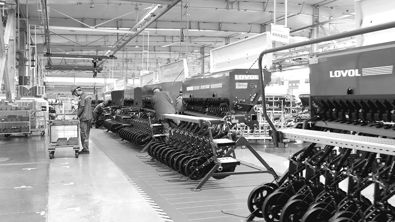 在大马力拖拉机“智慧工厂”,智能化装备与MES系统默契配合生产效率达到了全新高度,产能较平日提升50%以上,履带机工厂通过产线优化与科学排产产能较平日提升30%以上。 (本报通讯员 柴伟 摄)