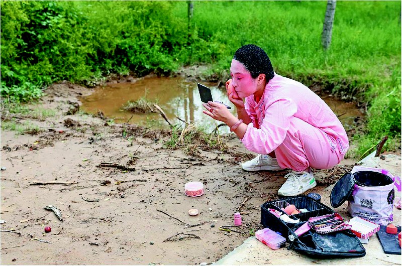 一轮降雨刚结束,演员们在郭楼村玉米地边的水洼旁化妆