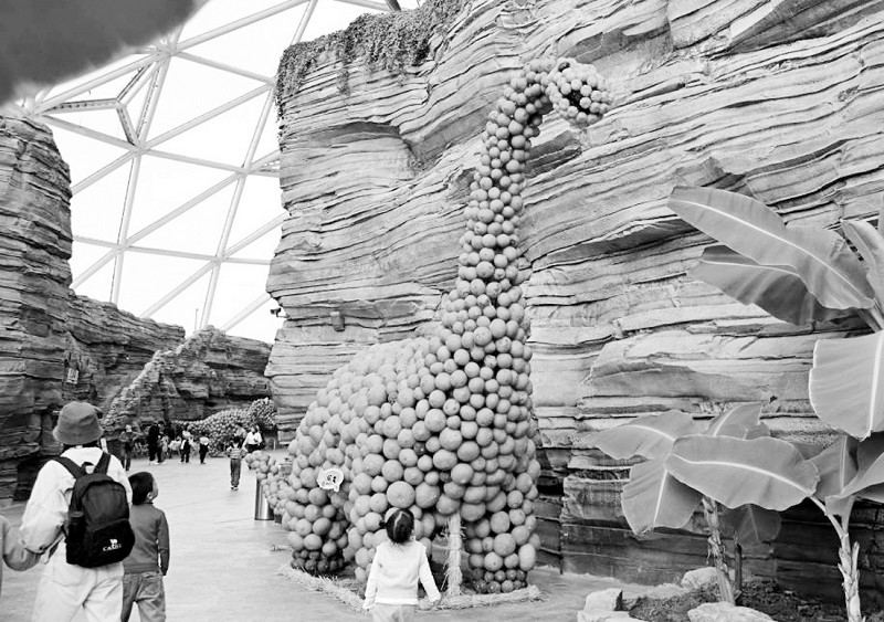 近日,青岛东方伊甸园举行“南瓜艺术王国”主题展,景区内用不同品种和色泽的南瓜搭建的卡通造型憨态可掬,吸引众多游客前来赏玩。图为游客从一处“南瓜恐龙”旁经过。 (新华社记者 李紫恒 摄)