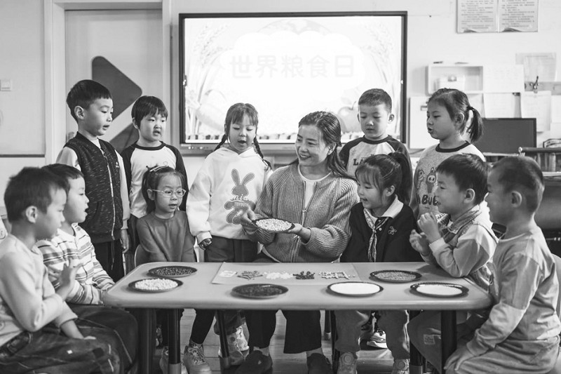 10月16日,在广饶县李鹊镇中心幼儿园,老师正在给孩子们讲解粮食作物的相关知识,让孩子从小养成节约粮食的好习惯。