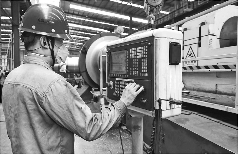 近日,在位于济南市的金雷科技股份公司生产车间内,技术人员正在操作控制面板,开展风电主轴生产作业。