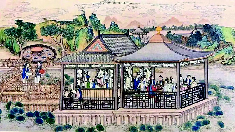 初秋时,大观园已有秋的踪迹。第二十六回中,藕香榭“盖在池中,四面有窗,左右有曲廊可通,亦是跨水接岸,后面又有曲折竹桥暗接”。众人上竹桥,凤姐搀着贾母笑道:“老祖宗走这里,我带你们瞧瞧咱们的水亭子。”贾母问起亭子归属,凤姐答是藕香榭,贾母赞园子干净,又提少些树木,凤姐忙说已让人栽花种草。榭内栏杆外摆着两张竹案,一张设杯箸酒具,一张放茶筅茶盂,丫头们或煽炉煮茶,或煽炉烫酒。贾母喜道:“这茶想的到,且是地方,东西都干净。”湘云笑着说是宝钗帮忙预备,贾母夸宝钗“细致,凡事想的妥当”。此时的秋带着夏日余温,景致鲜活,众人欢声笑语,尽显初秋惬意,也为后续秋日故事埋下伏笔。